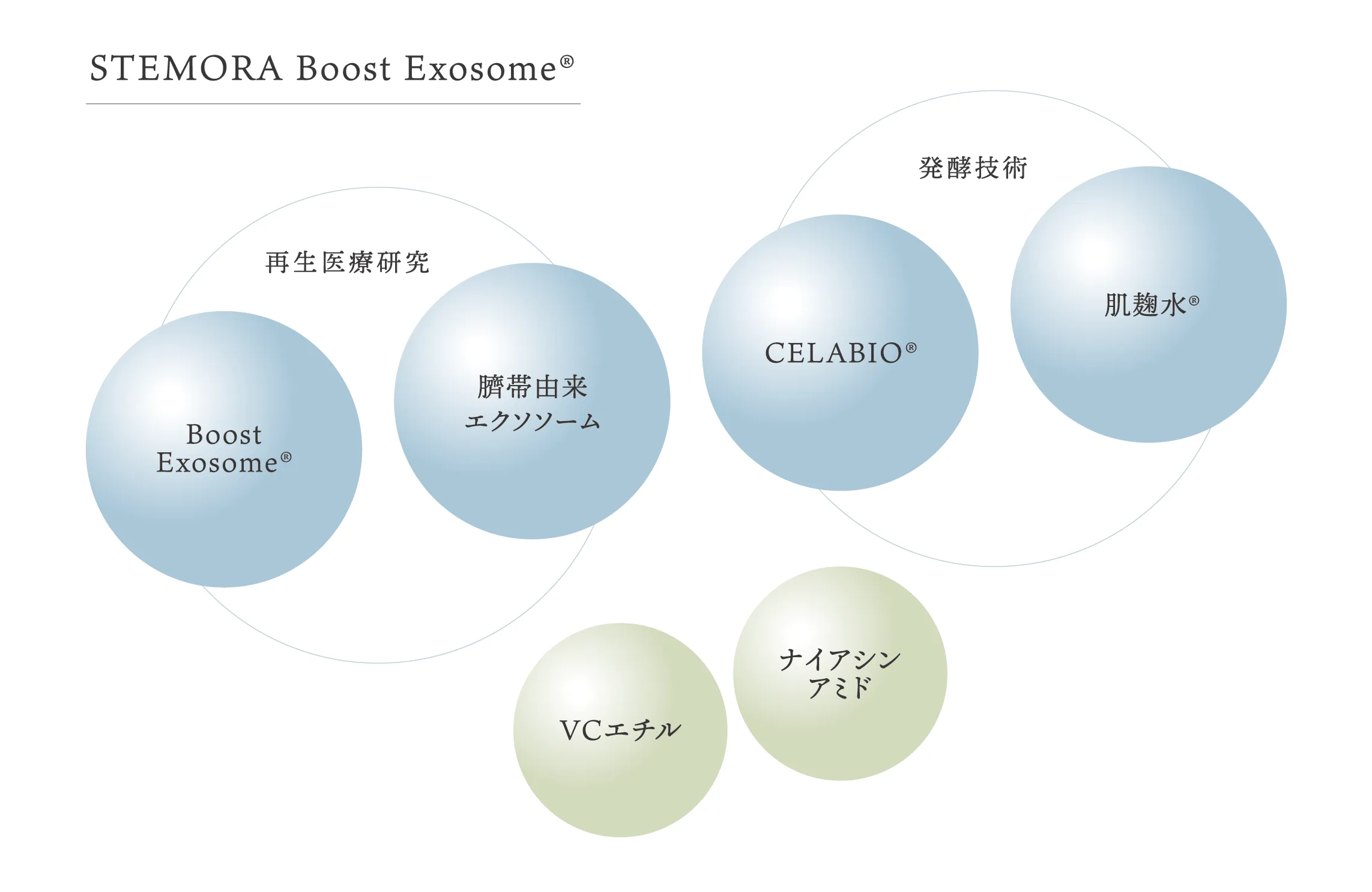 「STEMORA ブーストEXO美容液」のキー成分「Boost Exosome® *¹」の効果を余すところなく引き出すために、基材に水ではなく、ビタミン B 群やアミノ酸などの成分を含む「肌麹水® *² (はだこうじすい)」を採用し、臍帯由来エクソソーム*³、発酵エキス「CELABIO® *⁴」を独自のバランスで配合。「エクソソーム」×「発酵技術」の相乗効果により、「潤いを与えて、肌みずからの健やかな美しさをサポートする」というアプローチを実現。